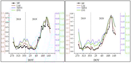 Previous applications of satellite SIF products in crop growth monitoring and yield estimation have been somewhat more limited. To further assess the applicability of downscaled SIF products in crop growth analysis, spatial SIF values were extracted from wheat-growing areas in Shandong Province. Using the GLASS LAI remote sensing products and long-term observation of climatic records from agro-meteorological stations, we defined the inflection points and peaks of the key climatic periods of each crop. These key nodes of the LAI characteristic curves were identified by the inflection point and threshold methods, thus accurately capturing the growth dynamics of wheat in a year. In addition, the SIF, LAI, NDVI, and EVI data at the same spatial and temporal scales were selected to analyze the response of their changes to the growth status of wheat over eight days. The results showed that the trends of the SIF values closely followed those of the LAI, NDVI, and EVI, with SIF changes exhibiting greater stability than the other vegetation indices (Figure 15). Specifically, October marked the sowing period of wheat. From November to January, during winter, wheat’s vegetation index fluctuated significantly due to temperature effects, and the SIF values were also influenced by temperature and snow cover, which reduced sunlight absorption, reaching their lowest point in January. As temperatures increased from February to April, the vegetation index gradually rose, and in April, wheat growth reached its peak, coinciding with the highest SIF values. By May, as the wheat was harvested, both the SIF and vegetation index values began to decrease gradually. The wheat growth cycle showed similar trends in both years.