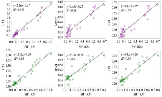 Furthermore, we conducted a correlation analysis between downscaled 1 km SIF and three vegetation indices. Figure 16 shows that the correlations in both years were high (R2 > 0.8), with the strongest correlation observed with the LAI (R2 > 0.95). This indicates that downscaled SIF not only possesses similar structural characteristics to traditional vegetation indices but also can outperform them to a certain extent due to its mechanism of spontaneous luminescence based on sunlight stimulation. Therefore, the accuracy of downscaled SIF and its potential and effectiveness in this application area was verified through crop growth.
