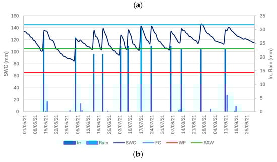 Soil water content (SWC), irrigation volume (Irr), and rainfall during the 2021 (a) and 2022 (b) seasons. Red is the value threshold of the wilting point (WP), blue is the field capacity (FC), and green is the readily available water (RAW).