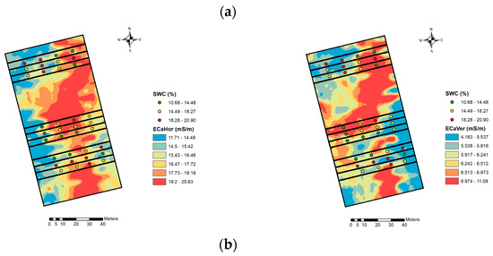Electromagnetic induction (EMI) maps in May 2021 (a) and June 2022 (b) in horizontal mode (ECa-Hor) and vertical mode (ECa-Vert). SWC direct soil sampling scheme. The lines indicate the row of trees tested.