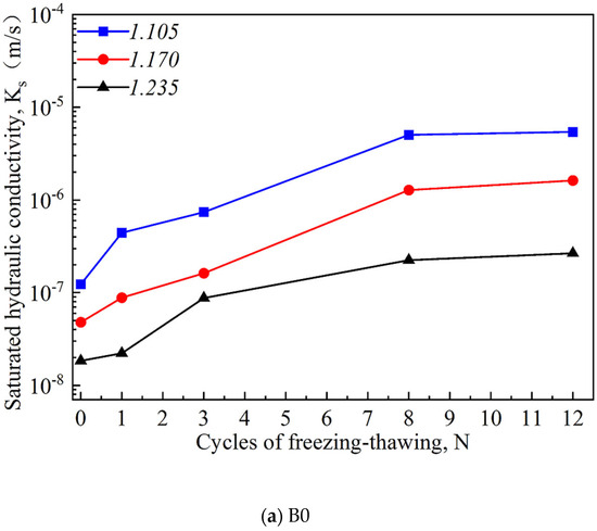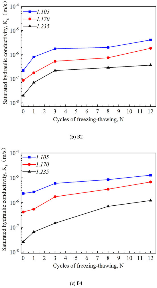 The BAC exhibited considerably lower Ks values for all three soil densities examined (Figure 2b–d). For instance, in the case of no freezing–thawing cycles, Ks values decreased from 1.8 × 10−8 m/s to 3.8 × 10−9 m/s for the dense sample when the biochar content increased from B0 to B8. This may be because when biochar is added to clay soil, the soil particles become more densely packed, leading to a higher proportion of macropores within the soil structure. The larger size of biochar particles relative to soil particles allows them to occupy the spaces between soil particles, thereby leading to a decrease in the number of macropores within the soil.