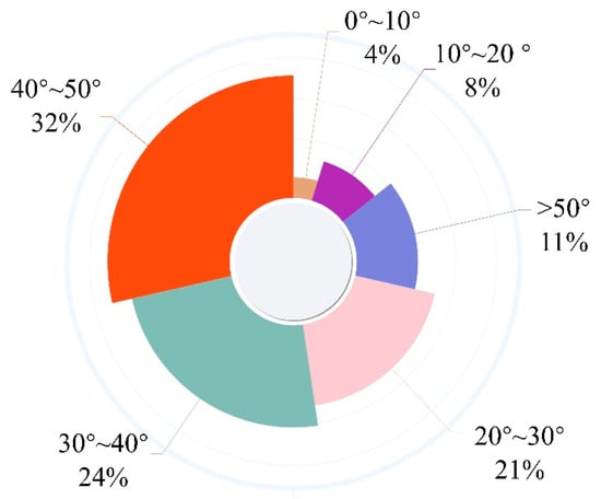The leaf inclination angle in the sampling area was measured, revealing that the upper leaves had larger inclination angles while the lower leaves had smaller angles. The distribution of leaf inclination angles is shown in Figure 2. Leaves with inclination angles greater than 30° made up over 65% of the total, with average angles of 45° for upper canopy leaves, 35° for middle canopy leaves, and 25° for lower canopy leaves.