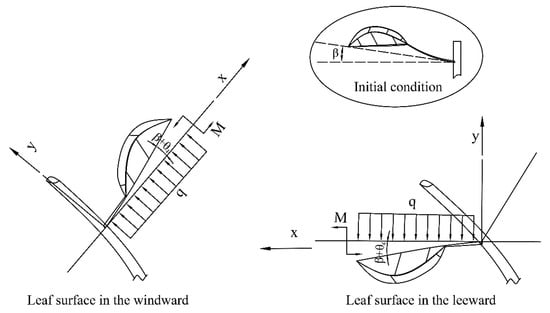 When the leaf is subjected solely to a uniformly distributed load, it moves upward and flips. Additionally, under the influence of the airflow, both sides of the leaf bend inward to overcome the resistance of the leaf veins. The deflection curve equation and the expression for the angular displacement are as follows: