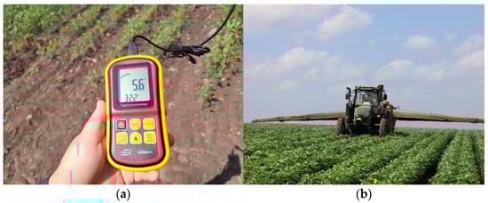 The experiments were conducted in the test field of Kedong County, Heilongjiang Province, China. Meteorological conditions, such as temperature, humidity, and wind speed, influence the effectiveness of spraying. To enhance the generalizability of the study’s results, field trials were conducted from 3:00 to 5:00 p.m., when temperatures are higher and evaporation rates are faster. During this period, the ambient temperature was 32.2 °C, with a relative humidity of 65% and a northern wind direction. The maximum wind speed recorded was 5.6 m/s. A photograph of the experimental site is shown in Figure 7b.