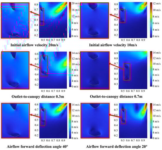 As shown in Equation (4), the distance between the outlet and the canopy is a key factor influencing the airflow velocity before it reaches the canopy. The closer the auxiliary airflow is to the canopy, the smaller the velocity attenuation.