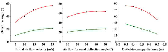 Scatter plots were created to represent the relationship between the leaf angle of rotation for the top and middle leaves and the three key factors: initial airflow velocity, airflow forward deflection angle, and outlet-to-canopy distance. Polynomial fitting equations were applied to these plots, as shown in Figure 11. The red curve represents the fitted rotation angle for the top leaf, while the green curve represents the fitted rotation angle for the middle leaf.