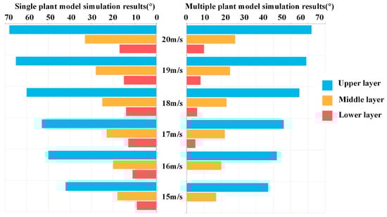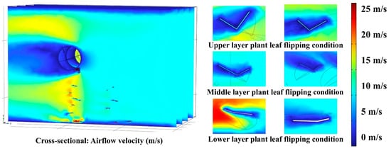 The results of the single-factor simulations indicate that the initial airflow velocity, the airflow forward deflection angle range, and the outlet-to-canopy distance affect the leaf-reorientation angle. The study found that when the initial airflow velocity exceeds 20 m/s, the change in the leaf-reorientation angle becomes less pronounced. Furthermore, excessively large angles may lead to the tearing or breakage of the leaves. Thus, the maximum initial airflow velocity is set at 20 m/s.