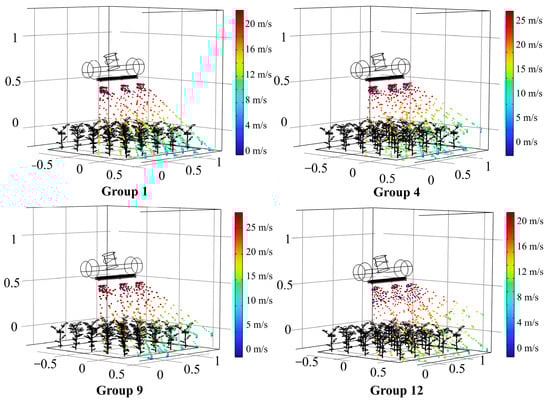 Figure 10 illustrates the process of a single-factor simulation. The analysis reveals the relationship between initial airflow velocity, airflow forward deflection angle range, and the outlet-to-canopy distance. As the airflow velocity, angle, and distance increase, the windward leaf elevation angle increases, and the tendency for the leaf to fold inward along the midrib also intensifies. This leads to a higher likelihood of effective droplet deposition on the back of the leaf. Additionally, for lateral leaves, the bending of the stem and the downward pressure exerted on the leaf surface from the wind increase the chance of droplet deposition on the leaf’s underside.