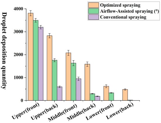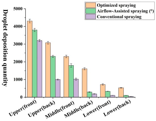 Furthermore, Sun et al. (2021) [43] further highlighted that an appropriate spray angle could effectively enhance droplet deposition. Although this improvement diminishes as the canopy penetration increases, the average droplet deposition and penetration rate within the canopy are still enhanced. Our results are consistent with this, suggesting that adjusting the synchronization angle between the airflow and spray can improve droplet deposition within the canopy. These findings support the practical application of optimizing airflow-assisted spraying parameters for pesticide application and crop protection. Figure 15 shows the average droplet deposition quantities on the upper, middle, and lower canopy leaf positions (both front and back) for conventional spraying, conventional airflow-assisted spraying.