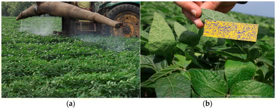 Based on the analysis of simulation experiments and the requirements of practical agricultural production, droplet deposition tests were conducted on the dorsal surface of soybean leaves and the middle and lower canopy layers during the V7 growth stages. To minimize experimental errors, the sampling distance for each trial was set to 5 m, with the length of each sampling area fixed at 10 m. The deposition effect was investigated by attaching water-sensitive paper (Sygenta brand) to the soybean leaves using paperclips and staplers on the front and back sides of the plant’s upper (Figure 8a), middle, and lower leaves (Figure 8b) [35].
