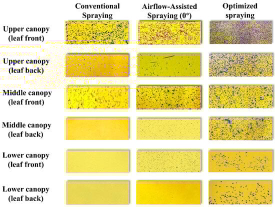 In conventional spraying, the droplets deposited on the leaves exhibited irregular deformation. This phenomenon is attributed to the high natural wind speed [48,49], which causes plant stems and leaves to oscillate, leading to changing angles between the droplets and the target at deposition [50]. As a result, the droplets could not stabilize on the target, leading to tailing [51]. In contrast, the optimized airflow-assisted spraying operation produced fewer tailing droplets on the water-sensitive paper. The airflow curtain reduced the effect of irregular natural winds on plant stems and leaves while decreasing the angle between the droplets and the target, reducing the effect force during deposition. Furthermore, the optimal forward spray angle enhanced the droplets’ penetration ability, increasing droplet deposition on the lower and middle canopy leaves [52].