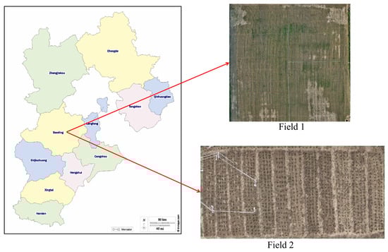 General map of the experimental site. Field 1 is the Xushui Scientific Research Base of the Baoding Academy of Agricultural Sciences (39°30′ N, 115°36′ E). Field 2 is the East Campus of Agricultural University of Hebei (38°51′ N, 115°28′ E).