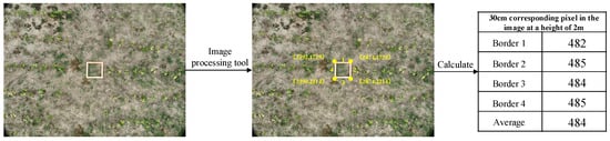 The processing workflow for images with a 30 cm square reference frame at different heights is illustrated using a 2 m image as an example (Figure 3). The pixel coordinates of the four corners of the reference frame were determined via image processing tools. By calculating the differences in coordinates, the pixel lengths of the four edges in the image were obtained. Although slight variations existed in the lengths of these edges in the pixels, averaging the values established the proportional relationship between the image pixels and the actual distance. At a height of 2 m, 484 pixels corresponded to an actual distance of 0.3 m, resulting in a ratio of 4840:3; at a height of 5 m, 213 pixels represented 0.3 m, resulting in a ratio of 71:10; and at 7 m, 154.5 pixels corresponded to 0.3 m, resulting in a ratio of 515:1. On the basis of these ratios, the area of images at any resolution can be calculated for a given height, thereby providing a data foundation for obtaining the seedling emergence rate.