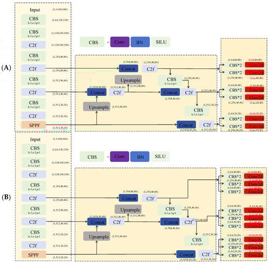 Comparison of YOLOv8 and YOLOv8-obb network structure. (A) YOLOv8 network structure. (B) YOLOv8-obb network structure.