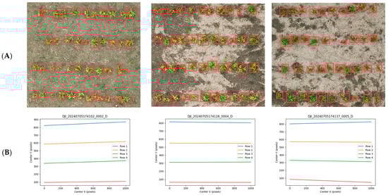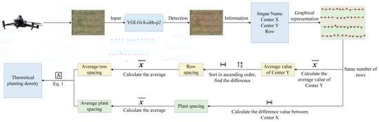 This study uses the YOLOv8-obb-p2 model to analyze the field images, extracting the pixel coordinates of the centroid points for each target, specifically Centre X and Centre Y, which serve as feature points. The feature points are categorized using the K-means clustering algorithm into distinct rows on the basis of their coordinate information, with the resulting cluster labels stored in the variable “cluster_labels”, and the average value of Centre Y for all feature points within each row is calculated, followed by ascending sorting. The differences between adjacent rows yield the row spacing. The Centre X values of adjacent feature points within each row are sorted in ascending order, and a difference operation is performed to obtain the plant spacing. Given the inherent variability in distances between rows and between plants, the average operation is performed on the obtained row distance and plant distance, respectively. The resulting row and plant spacings are measured in pixels, and the established ratio of pixels to actual distance for images captured at varying heights allows for the derivation of actual row and plant spacings. After these measurements are obtained (Figure 6), the theoretical planting density can be calculated for a specified cultivation area on the basis of the row and plant spacings (Equation (1)). where represents the theoretical planting density, represents the row spacing, and represents the plant spacing. Although multiple observation paths of 80 cm and 120 cm have been reserved at the Xushui Research Base of the Baoding Academy of Agricultural Sciences during planting, this does not affect the calculation of the theoretical planting density, as the formula remains applicable.