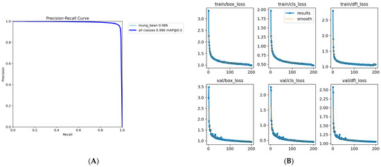 To further analyze the performance of the YOLOv8-obb-p2 model in the mung bean plant detection task, its Precision-Recall (PR) curve and loss variation curves across multiple epochs were plotted (Figure 7). The PR curve exhibits a large and smooth area, indicating that the model effectively balances precision and recall across various decision thresholds. The loss variation curves demonstrate a consistent decline in training and validation losses (box_loss, cls_loss, and dfl_loss) as the training epochs progress, eventually stabilizing. This suggests that the model achieves good convergence. Furthermore, the close alignment of validation loss with training loss reflects the model’s strong generalization capability. The absence of significant rebound in the validation loss curve during later stages further validates the model’s ability to mitigate overfitting effectively.