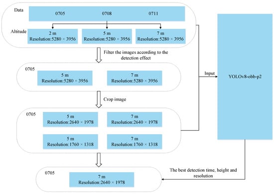 A comparative analysis of the detection results reveals that the cropped image with a height of 5 m and the 7 m height image with a resolution of 1760 × 1318 exhibited a richer level of detail post cropping, leading to an increased tendency for the model to misidentify a single plant as multiple plants. In contrast, the 7 m images cropped to a resolution of 2640 × 1978 showed a significant reduction in missed detections compared with the uncropped 7 m images but also outperformed the 7 m images at the lower resolution of 1760 × 1318 in terms of misidentification. Thus, it can be concluded that cropping the 7 m images taken on 5th July to a resolution of 2640 × 1978 yields optimal detection results via the YOLOv8-obb-p2 model.