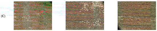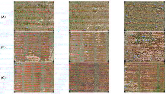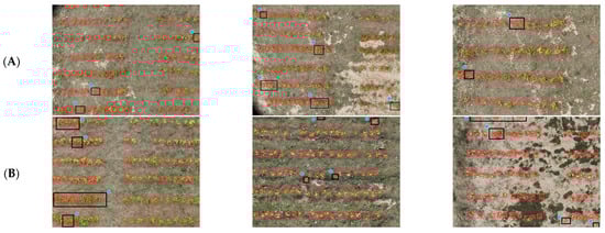 Image detection results at different heights and resolutions on July 5th. Red boxes represent the detection frame, while black boxes and blue numbers highlight missed and misidentified areas. (A) Five-meter resolution 2640 × 1978 and 1760 × 1318 image-detection effect, the first two’s resolution is 2640 × 1978, the third’s resolution is 1760 × 1318. (B) Seven-meter resolution 1760 × 1318 image-detection effect. (C) Seven-meter resolution 2640 × 1978 image-detection effect.