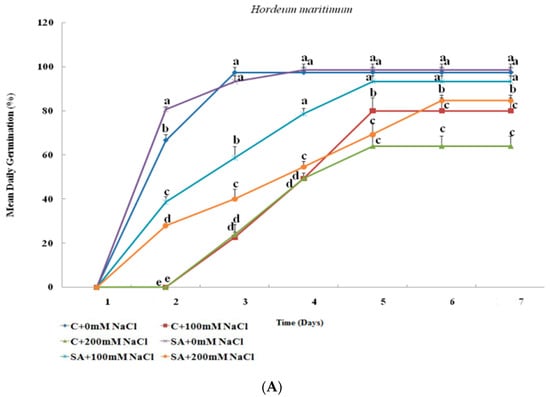 Effect of SA seed priming and no pretreatment (Control: C) on the Mean Daily Germination of two barley species, Hordeum maritimum (A) and Hordeum vulgare (B), grown under salinity stress. Values are means of three replicates ± standard error. Data with the same letter are not significantly different at p < 0.05 (Duncan’s test).