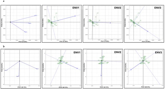 Genotypes were ranked according to grain yield performance in each environment across the normal (Figure 2a) and summer (Figure 2b) seasons. The line (with an arrow) that passes through the biplot origin and the environment is called the axis for the environment [35], and along this axis, genotypes are ranked. In the normal season, genotypes G9 and G24 yielded higher than the mean yield in ENV1, ENV2, and ENV3, highlighting their adaptability across different conditions. This approach to ranking genotypes along the environmental axis has been effectively used in studies to evaluate yield stability, as described by Gauch et al. [36], who emphasized that the biplot method offers a transparent and interpretable way of assessing genotype stability across multiple environments. Such methods are beneficial for identifying genotypes with broad adaptability, providing valuable insights for breeding programs targeting multi-environment resilience.