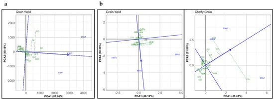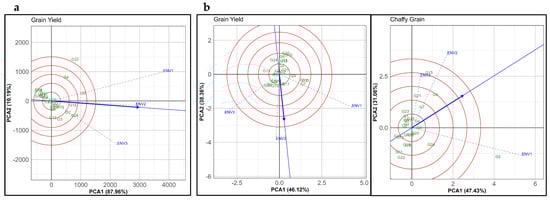 In this study, the GGE biplot “mean vs. stability” analysis explained 98.15% of the total variation in grain yield for the normal season (Figure 3a), 84.53% for grain yield, and 94.82% for chaffy grain under the summer season (Figure 3b). The average-environment axis (AEA) or AEC abscissa, indicated by the single-arrowed line, reflects the mean yield across the three environments. The proximity of ENV2 to the AEA suggests it had the highest alignment with the season mean yield, offering a consistent reference for evaluating genotypes. This approach aligns with Yan and Tinker’s [35] findings, emphasizing the AEA’s role in GGE biplots for accurately identifying high-yielding, stable genotypes across environments. In the normal season, genotype G9 displayed high mean yield and stability, followed by G24 and G18, with G6, G5, and G23 near the grand mean. G14 and G16 showed the lowest mean yields. The combination of high yield and stability in the G9 genotype suggests its potential as a broadly adaptable cultivar, an essential trait for multi-environment cultivation [35]. Conversely, genotypes G22 and G4, though high yielding, showed low stability due to their distance from the AEA, reflecting significant environmental interactions. These findings echo Torres-Ordoñez et al. [40], who observed that high-yielding genotypes may not consistently demonstrate stability due to environmental variability. It is essential to balance yield with stability when selecting ideal genotypes.