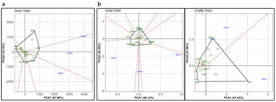 Polygon view of GGE biplot displaying the ‘Which-won-where’ pattern of genotype main effect and G × E interaction effects in 24 proso millet genotypes evaluated under three different environments in the (a) normal and (b) summer seasons for grain yield (GY) and chaffy grain (CGY). The biplots were generated using Column Metric Preserving SVP and Tester-Centered G + GE with no scaling.