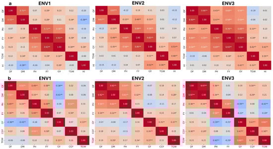 Heat map showing the Pearson’s correlation coefficient (r) between selected traits under ENV1, ENV 2, and ENV 3 in (a) normal and (b) summer seasons. * p < 0.05; ** p < 0.01; DF, days to flowering; DM, days to maturity; PH, plant height; FY, fodder yield; GY, grain yield; CGY, chaffy grain yield; TGW, 1000-grain weight; and HI, harvest Index.