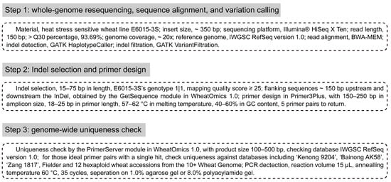 Indels were further filtered according to E6015-3S variations in 2023, using the following parameters: E6015-3S allele as ‘1|1’ (i.e., homozygous alternative allele), mapping quality score >= 25, and indel size 15–75 bp. For each indel, flanking sequences of about 300 bp in length (upstream 150 bp, downstream 150 bp) were retrieved from the wheat reference genome (IWGSC RefSeq version 1.0) by using the GetSequence module in WheatOmics 1.0 (http://wheatomics.sdau.edu.cn, accessed on 5 December 2024) [40]. The yielded sequences were used for primer design using Primer3Plus (https://www.primer3plus.com, accessed on 5 December 2024) [41] with the following parameters: “product size ranges: 100–320 bp”, “primer size: min 18 bp, opt 20 bp, max 25 bp”, “Primer Tm: min 57, opt 60, max 62”, “Primer GC%: min 40%, opt 50%, max 60%”, and “Number of return: 5 primer pairs”. Obtained primer pairs were further checked for genome-wide uniqueness with the “Specificity Check” function in the PrimerServer module from WheatOmics 1.0 [40] using the following parameters: “product size: 100–500 bp” and “checking database: ‘Chinese Spring’ IWGSC RefSeq version 1.0”. Only primer pairs with one single amplicon in the wheat genome were kept and used for further analysis (Figure 1).