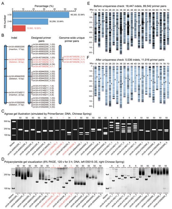 Development of 11,016 genome-wide unique primer pairs targeting 5036 indel sites. (A) Sequence alignment of 89,542 primer pairs against the ‘Chinese Spring’ reference genome (IWGSC RefSeq version 1.0), which was performed with the PrimerServer module in WheatOmics 1.0 [40]. (B–D) The agarose gel illustration (simulated by the PrimerServer module in WheatOmics 1.0) and polyacrylamide gel visualization (8% PAGE, 120 v for 3 h) for a few primer pairs. Primer pairs with multiple hits (in black) tended to yield overlapped or blurry shadow bands, whereas the ones with a unique hit (in red) tended to produce a single and polymorphic band. (E,F) The indel sites targeted by primer pairs along each chromosome before (E) and after (F) the uniqueness check. Detailed information is presented in Table S2.
