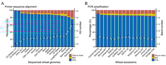 To check the specificity of the indel markers in the wheat genome, primer sequences were blasted against 18 versions of sequenced wheat genomes, including the two versions of ‘Chinese Spring’ (IWGSC RefSeq versions 1.0 and 2.1), ‘Kenong 9204’, ‘Bainong AK58’, ‘Zang 1817’, Fielder and 12 versions from the 10+ Wheat Genomes (Table S3). In the IWGSC RefSeq version 2.1 of ‘Chinese Spring’, 10,775 primer pairs produced a single hit, a ratio of 97.81% of the blasted 11,016 primer pairs, which is almost the same as that (99.34%) in IWGSC RefSeq version 1.0 (Figure 3A). This ratio among the rest genomes is slightly lower, from 76.18% (8392) in ‘Kenong 9204’ to 91.58% (10,089) in ‘Zang 1817’ (with an average of 87.25% (9611.50)), because of an elevated proportion of the ‘two and more’ alignment (Table S4). As for the null alignment, its ratio is quite similar among tested genomes, from 2.02% (223) in Kariega to 4.17% (460) in Jagger, but with exceptions of the two versions of ‘Chinese Spring’ (version 1.0, 0.00%, 0; version 2.1, 0.17%, 19), ‘LangReach Lancer’ (7.01%, 772) and Renan (6.10%, 672). Accordingly, the average hit number of the 11,016 primer pairs among tested genomes varied from 1.01 to 1.30 (Table S3; Figure 3A).