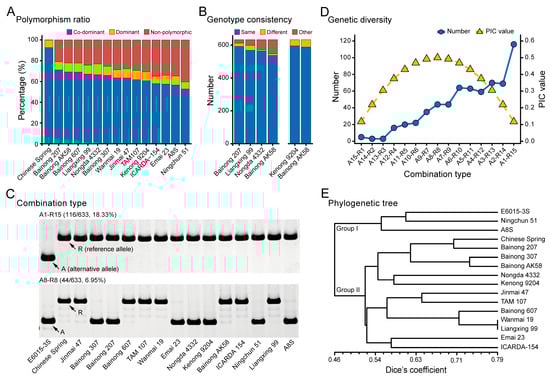Polymorphism of indel markers among 16 wheat accessions. (A), Polymorphism ratio between 15 individual wheat accessions and E6015-3S. (B), Genotype consistency in the allele information collected from different ways: left, between PCR amplification and whole-genome resequencing; right, between PCR amplification and reference genome sequence. (C,D), The 15 combination types formed within the 633 indel markers, which yielded only two separate alleles, i.e., the reference (R) allele from ‘Chinese Spring’ and the alternative (A) allele from E6015-3S. (E), Phylogenetic tree showing the genetic relations among the 16 wheat accessions, which was constructed using the mentioned 633 indel markers. Detailed information is presented in Tables S7 and S9–S12.