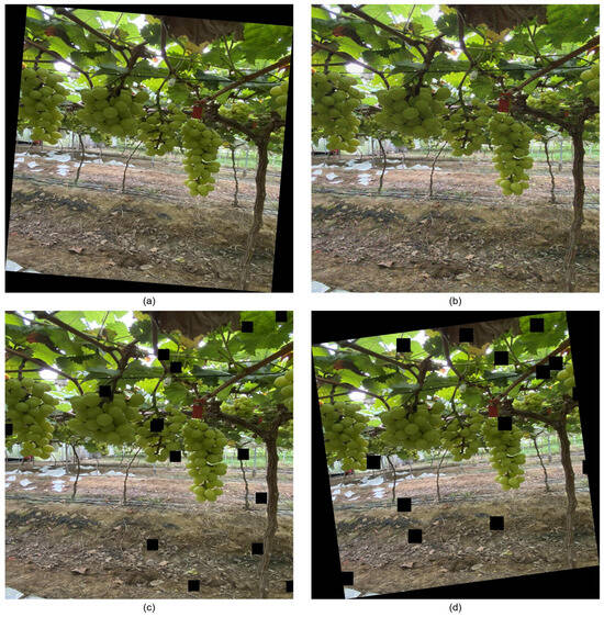 (a) Rotation, simulating various capture angles in real orchard environments; (b) image blurring, mimicking motion blur caused by wind or camera movement; (c) noise addition, emulating sensor noise and environmental interferences, and (d) combined rotation and noise addition, demonstrating the effect of both geometric and visual distortions.