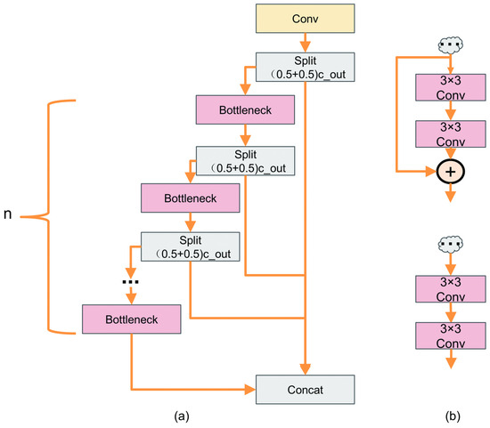 (a) details of the C2f module; (b) details of the Bottleneck module in C2f.