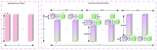 Given the resource constraints of many edge computing devices, we aimed to further reduce the weight of our model while preserving its accuracy. Dual Convolution [24] integrates the strengths of Group Convolution (GroupConv) [25] and Heterogeneous Convolution (HetConv) [26], optimizing both feature extraction and information processing to enhance model efficiency and performance. GroupConv processes only a subset of input channels at a time, which effectively lowers the computational cost of convolution operations. Replacing standard convolutions with Dual Convolution significantly reduced computational cost and the number of Params, while maintaining or even improving model performance.