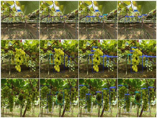 Figure 10 illustrates the original test images, ground truth, and the detection results produced by both YOLOv8n and our model. The results clearly demonstrate that our model exhibits superior robustness in detecting small and overlapping targets when compared with YOLOv8n. Specifically, as shown in the third and fourth columns of Figure 10, YOLOv8n struggles to detect partially occluded and closely packed “Sunshine Rose” grapes, often missing or merging targets. In contrast, our model excels in these scenarios by effectively extracting multi-scale features through Dynamic Convolution. This enhancement allows our model to better capture the subtle characteristics of small and overlapping objects.