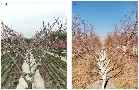 Growth status of experimental plants. (A) Images of the peach blossom period, taken on 27 April 2024. (B) Pictures of the dormant period, taken on 25 November 2024.