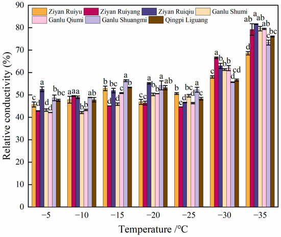 Changes in relative electric conductivity of seven varieties of peach under different low temperatures. Data are mean ± SE (n = 3), and different letters indicated significant differences among different varieties (p < 0.05, Duncan test).
