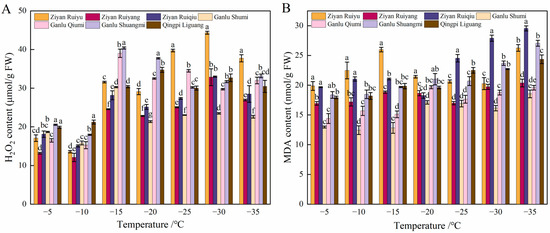 Changes of H2O2 and MDA contents in six peach varieties at different low temperatures. (A,B) represent H2O2 and MDA content, respectively. Data are mean ± SE (n = 3), and different letters indicated significant differences among different varieties (p < 0.05, Duncan test).