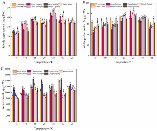 Changes in soluble sugar content, soluble protein, and free proline in six varieties at different low temperatures. (A–C) respectively represent the content of soluble sugars, soluble proteins, and proline. Data are mean ± SE (n = 3), and different letters indicated significant differences among different varieties (p < 0.05, Duncan test).