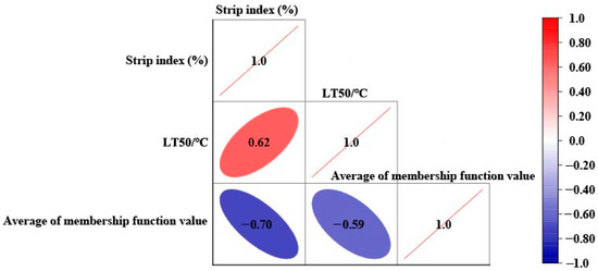 Correlation analysis of stripe index, LT50, and membership function of different peach varieties.