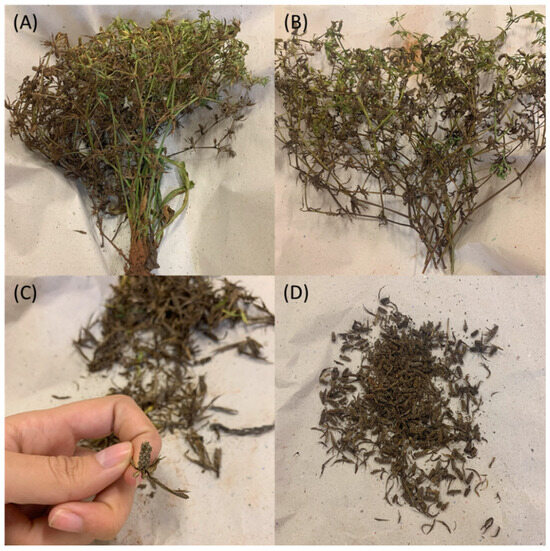 Post-harvest resting conditions of the Eryngium foetidum plant: whole plant with basal leaves and root system (A); aerial part (B); floral spikes (C); umbels (D).