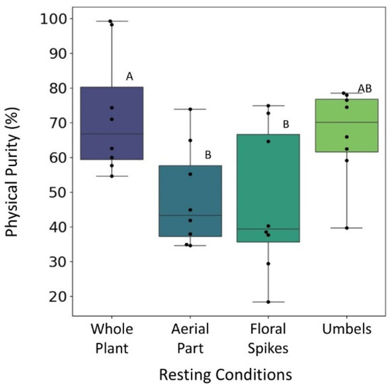 No significant differences were observed in seed yield, indicating that this indicator is not influenced by post-harvest resting conditions or durations. In contrast, seed purity was significantly affected by the resting conditions. Seeds subjected to the whole plant resting condition exhibited the highest purity (72.2%) compared to those exposed to other resting treatments (Figure 2).