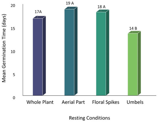 Germination tests were conducted with four replications of 50 seeds per treatment (four resting conditions—whole plant, aerial part, floral spikes, and umbels and two resting periods—7 and 14 days), following established protocols. Seeds were placed on two sheets of moistened germination paper, with a water-to-substrate ratio of 2.5:1. The seeds were then placed in transparent acrylic germination boxes (11 × 11 × 3.5 cm), which were sealed in plastic bags to maintain moisture levels. The boxes were kept in a biological oxygen demand (B.O.D.) growth chamber at 25 °C with an 8-h photoperiod, and germination was recorded when the radicle reached a length of 2 mm. The first germination count was made on day 21, with subsequent counts continuing until germination rates stabilized on the 45th day. Germination rates were quantified using the mean germination time (MGT) and germination speed index (GSI), calculated as described by Labouriau (1983) and Maguire (1962), respectively [28,29].