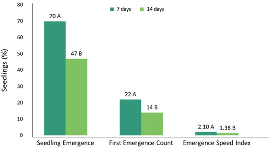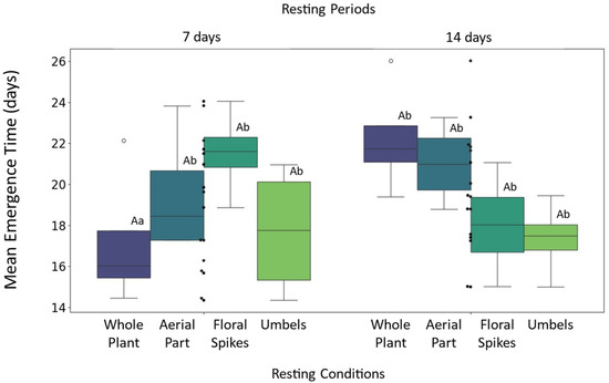 For the mean emergence time, seeds rested for seven days under the whole plant condition exhibited the shortest emergence time (17 days) (Figure 5). No significant differences were found between resting conditions for the fourteen-day period, with emergence times ranging from 17 to 22 days. Additionally, the highest seedling vigor was observed for seeds that rested for seven days under the entire plant condition (51%). When subjected to the fourteen-day resting period, seedling vigor significantly decreased for all conditions compared to the seven-day resting period (Table 1).