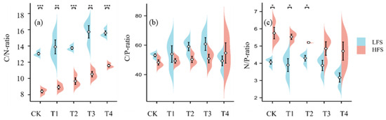 3.2. Effects of Different Organic Materials on Soil C, N, and P Stoichiometry