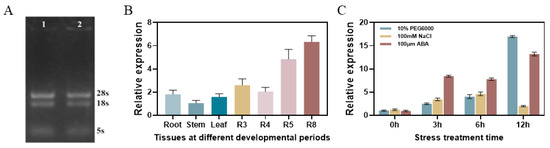 3.2. Analysis of Tissue-Specific Expression of GmPM35 Gene in Soybean and Its Expression Pattern Under Abiotic Stresses