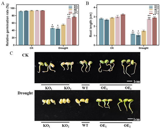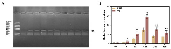 3.6. PCR Detection of Soybean Hairy Roots Overexpressing GmPM35 Gene and Expression Analysis of Overexpressed Soybean Hairy Roots Under Drought Stress