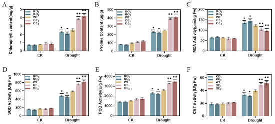 3.5. T2-Generation Transgenic Arabidopsis Rehydration Test and Physiological and Biochemical Detection of Transgenic Arabidopsis Under Drought Stress