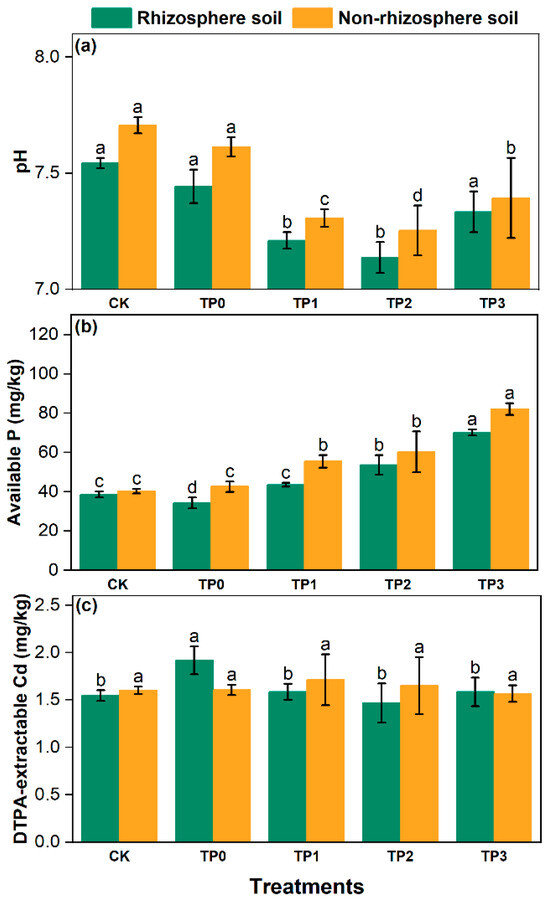 Soil pH (a), content of available P (b), and DTPA-extractable Cd (c) in rhizosphere and non-rhizosphere soils under different treatments. Different letters in columns of the same color indicate significant differences among treatments at the p < 0.05.