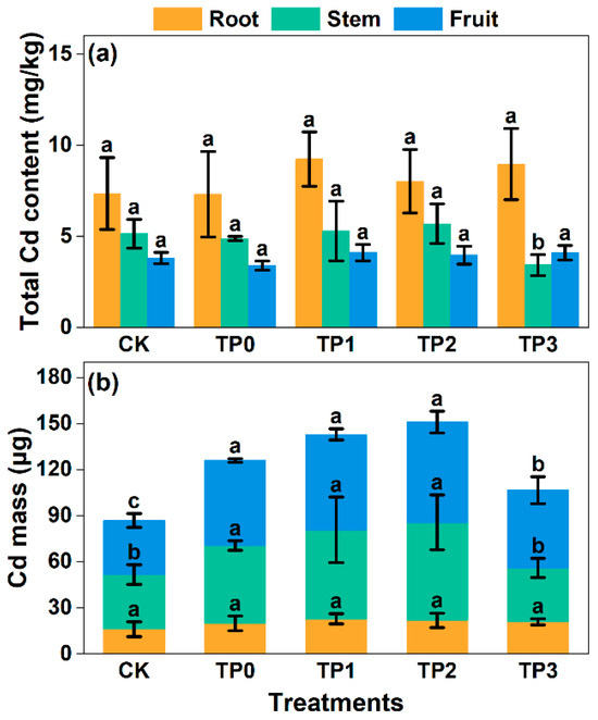 The Cd content in the major tissues of pepper is shown in Figure 3a. The Cd content in different tissues of the pepper ranged from 3.13 to 11.17 mg/kg. In general, the content of Cd decreased in the order of root (8.18 ± 0.89 mg/kg) > stem (4.89 ± 0.87 mg/kg) > fruit (3.88 ± 0.30 mg/kg). There was no significant difference in Cd content in the roots and fruits in all groups. However, the Cd content of the stems in TP3 (3.43 mg/kg) was lower than that in the other groups (4.87–6.87 mg/kg). When the biomass of the pepper tissues was considered, it was found that the fruit accumulated the greatest quantity of Cd (30.59–65.97 μg, Figure 3b). No significant difference was observed in the Cd mass in the roots across all treatments. The Cd mass in stems and fruits initially increased and then decreased with increasing P addition, and the Cd mass in stems and fruits in the CK and TP3 treatments was significantly lower than that in the other three treatments.